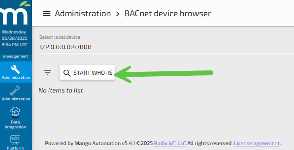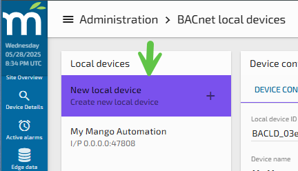 Log into Mango and navigate to Administration > BACnet Local Devices.