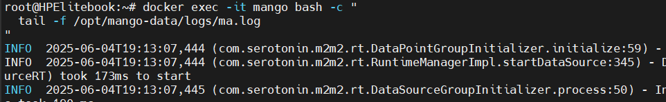 docker exec -it mango bash -c "tail -f /opt/mango-data/logs/ma.log"