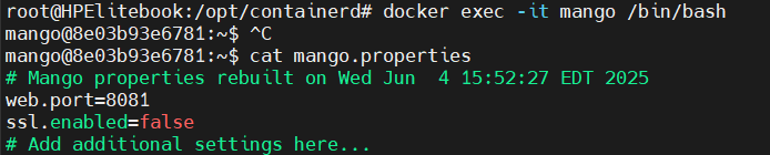 mango.properties Inside the ContainerMango’s main configuration file, mango.properties, resides at /opt/mango-data/mango.properties in the container. If you need to modify ports, SSL, or other settings, use one of these in-container methods—no vi or nano needed.